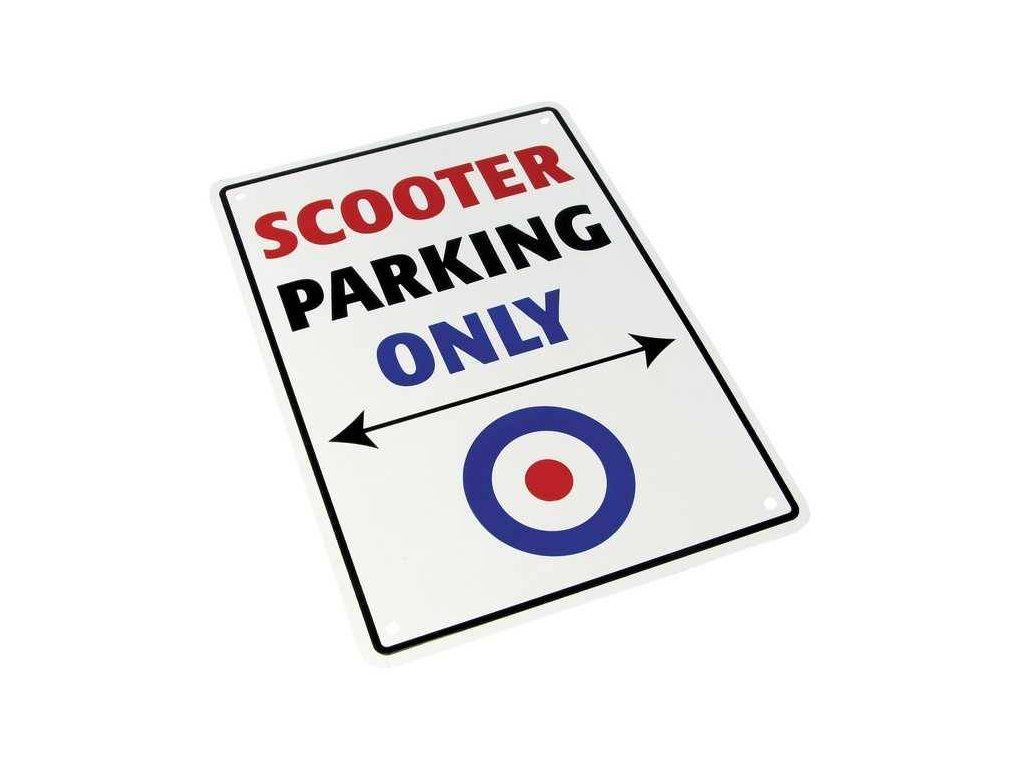Parkovací cedule "Scooter parking only", která bude ozdobou každé garáže. Cedule je vyrobena z hliníku a má vyvrtané otvory pro šrouby.