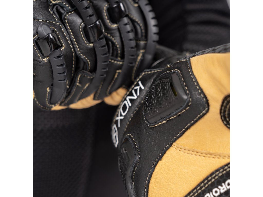 Knox Scaphoid Protection System (SPS) obsahuje měkký chránič Micro-Lock, což zajišťuje maximální absorpci nárazu, chrániče zasahují do okrajů rukavic. Dlaň je vyrobena 0,8 mm silné klokaní kůže, která nabízí výjimečný pocit komfortu a bezpečnosti. Zbytek rukavice je vyroben z bubnově barvené hovězí kůže.