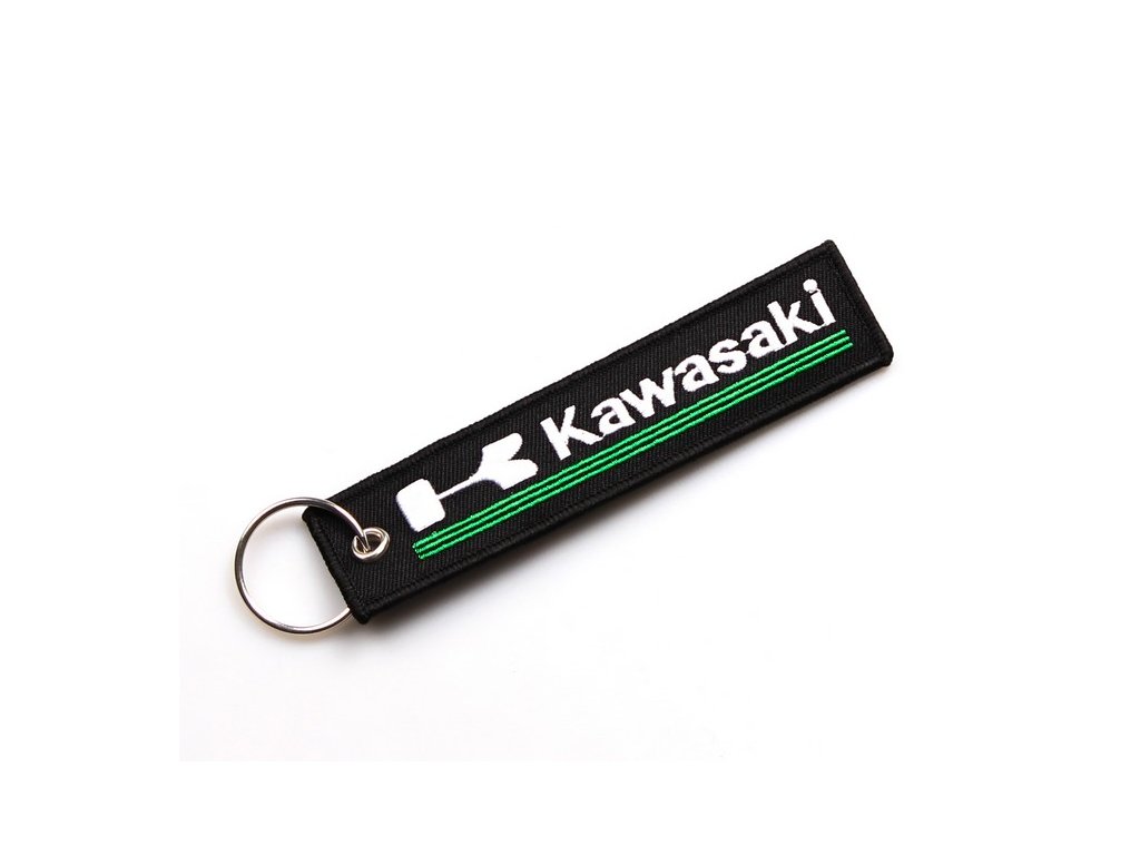 Textilní klíčenka Kawasaki - černé pozadí a bíle vyšitý nápis Kawasaki se zeleným trojitým podtržením. Pěkný dárek pro každého obdivovatele značky v podobě stylového přívěšku na klíče. K dispozici také další varianty Kawasaki klíčenek v naší nabídce.