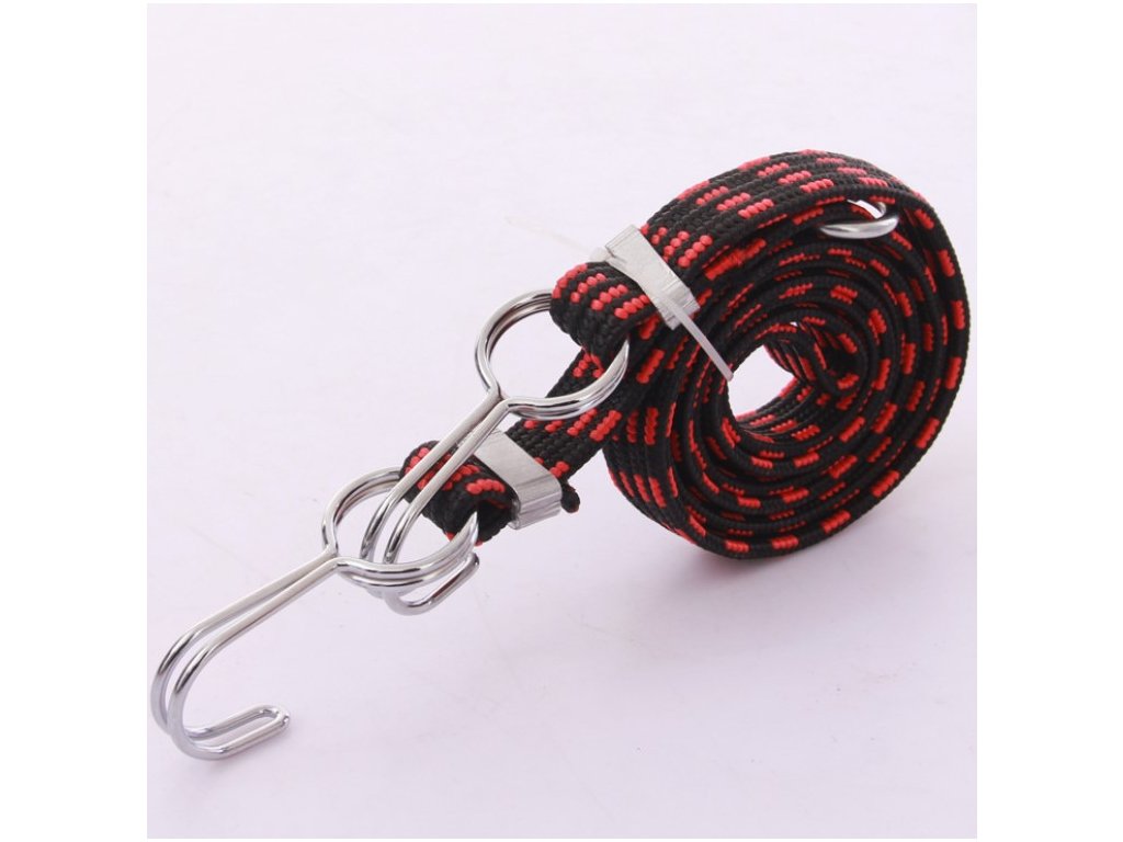 Plochá upínací guma ukončená háčky. Délka gumy 200 cm, šířka 23 mm. Maximální nosnost 20 kg. Otočné háčky z dvojitého drátu pro větší pevnost v tahu a snadné uchycení nákladu. Zaoblené konce háčků zabraňují poškrábání. Plochá guma pro ochranu nákladu.
