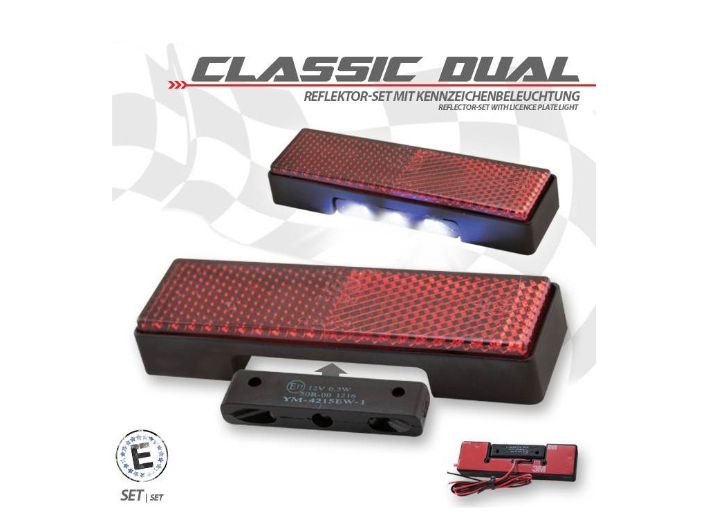 Zadní odrazka Classic Dual včetně osvětlení SPZ, rozměry: 94 x 27,5 x 9mm, samolepící, hom